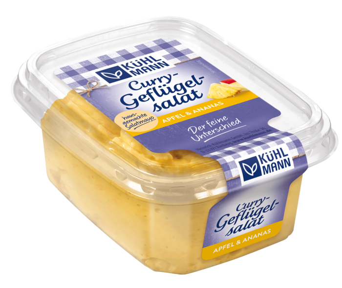 Cooked diced chicken breast 35% (chicken breast 34%**, salt), canola oil, apple 11%, pineapple 11%, added water, spirit vinegar, sugar, mango chutney (sugar, mango, spirit vinegar, garlic, salt, spices), egg yolk*, starch, salt, curry powder (contains mustard powder), carrot concentrate (colorant), lemon juice concentrate, spices, thickening agent: guar gum, acidity regulator: sodium acetate.