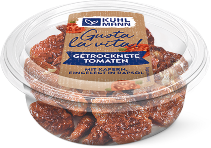 Marinated dried tomatoes 66% (dried tomatoes, added water, salt), canola oil 20%, spirit vinegar, capers 1.5%, sugar, herbs, iodized salt (salt, potassium iodate), salt, spices, acidifier: citric acid.