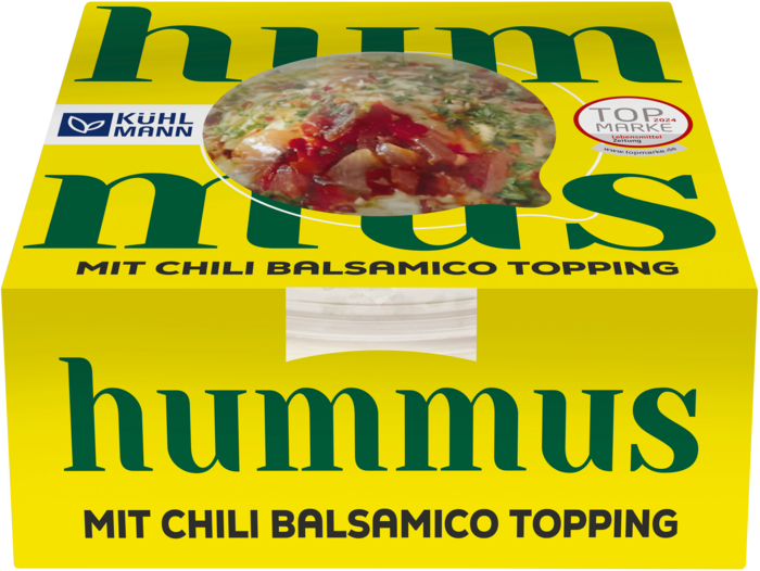 Chickpeas 50%, canola oil, sesame seeds 11%, added water, balsamic onion 5% (onion, added water, balsamic vinegar (wine vinegar, concentrated grape must, colorant: ammonium sulfite caramel coloring), sugar, salt, olive oil, antioxidant: sulfur dioxide, acidifier: citric acid), spirit vinegar, chili pepper 2%, sugar, salt, modified starch, granulated bell pepper, black sesame seeds, garlic, spices, lemon juice concentrate, herbs, starch, thickening agent: guar gum, acidity regulator: sodium acetate.