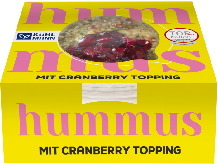 Chickpeas 49%, added water, canola oil, sesame seeds 11%, sweetened dried cranberries 5% (cranberries, sugar, sunflower seed oil), spirit vinegar, sugar, salt, modified starch, granulated bell pepper, black sesame seeds, garlic, lemon juice concentrate, spices, herbs, starch, thickening agent: guar gum, acidity regulator: sodium acetate.