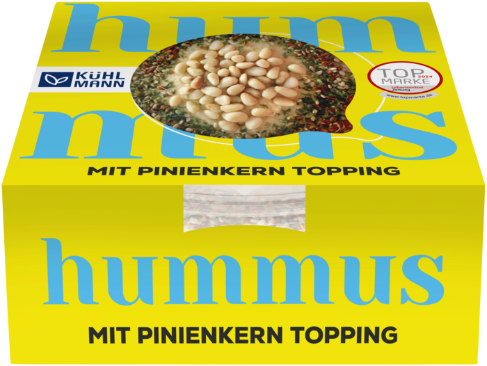 Chickpeas 53%, canola oil, sesame seeds 12%, added water, spirit vinegar, toasted pine nuts 2.6%, salt, sugar, modified starch, granulated bell pepper, black sesame seeds, garlic, spices, lemon juice concentrate, herbs, starch, thickening agent: guar gum, acidity regulator: sodium acetate.