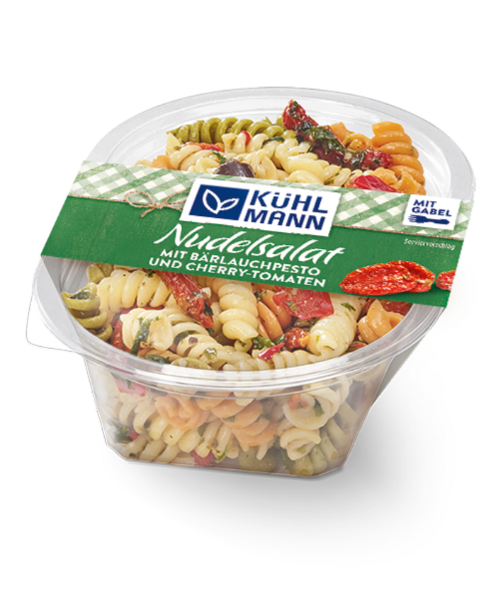 Pasta, cooked 62% (added water, durum wheat flour, whole egg*, powdered tomato, powdered spinach, salt), bell pepper 5%, semi-dried tomato 5%, wild garlic pesto 3% (wild garlic, canola oil, added water, garlic, salt, starch, cashews, hard cheese, acidifier: citric acid), sugar, pickled cucumber, preserved dried tomato (dried tomato, added water, salt), spirit vinegar, canola oil, balsamic vinegar (white wine vinegar, concentrated grape must), blackened olives**, salt, glucose syrup, herbs, sunflower seed oil, garlic, starch, spices, thickening agents: guar gum, xanthan gum; acidity regulator: sodium acetate.