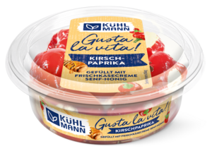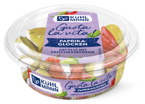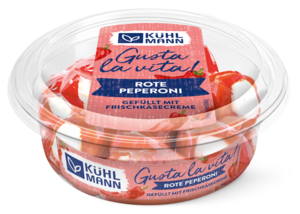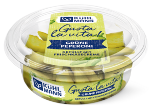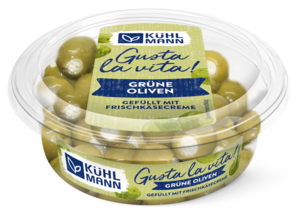 marinierte grüne Oliven, Kirschpaprika gefüllt mit Frischkäsecreme, grüne Peperoni gefüllt mit Frischkäsecreme