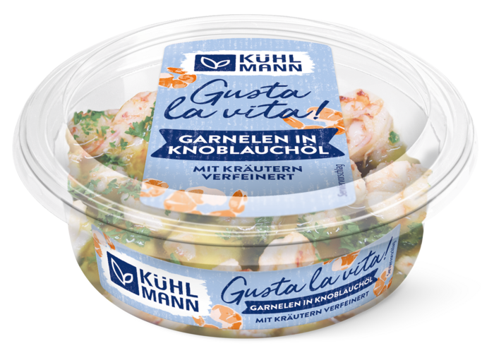 Garnelen 54 % (Litopenaeus vannamei*), Rapsöl 31 %, Knoblauch 5 %, Branntweinessig, Zucker, Speisesalz, Kräuter, Gewürz, Konservierungsstoff: Kaliumsorbat