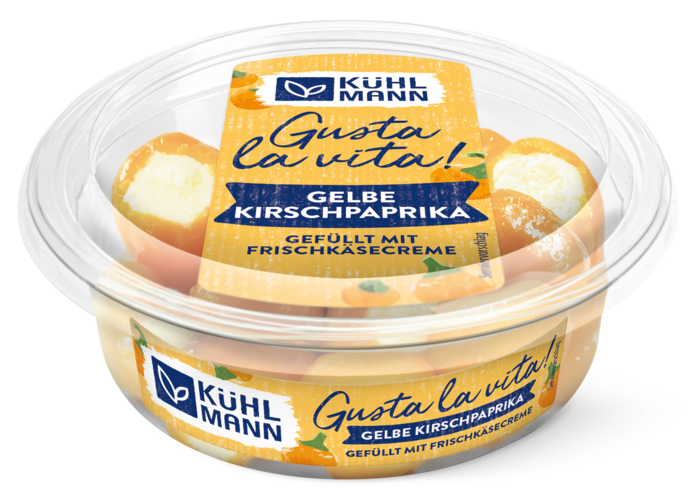 Kirschpaprika 52 %, Frischkäse 36 %, Oliven geschwärzt 4 % (grüne Oliven, Speisesalz, Stabilisator: Eisen(II)-gluconat; Säuerungsmittel: Milchsäure), grüne Peperoni 4 %, Rapsöl, Branntweinessig, Stärke, Zucker, Speisesalz, Säuerungsmittel: Citronensäure, Essigsäure; Festigungsmittel: Calciumchlorid.